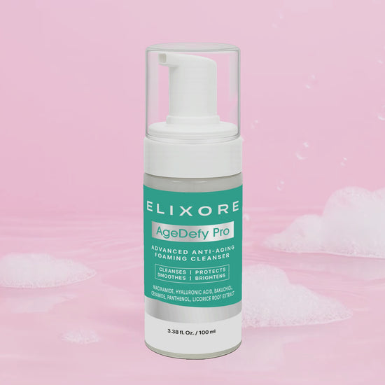 Elixore AgeDefy Pro Foaming Cleanser gently lifts away makeup, sunscreen, and daily buildup while helping maintain hydration and comfort. Formulated with skin-conditioning actives, it leaves skin feeling refreshed, soft, and perfectly prepped for serum and moisturizer.